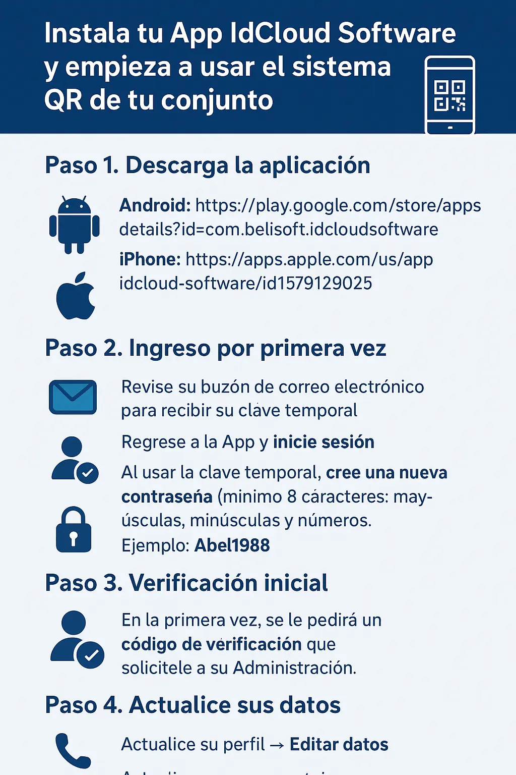 Mantén tu información actualizada y gestiona tus accesos, familiares e invitados de forma rápida y segura a través de nuestra aplicación IDCloud Software.